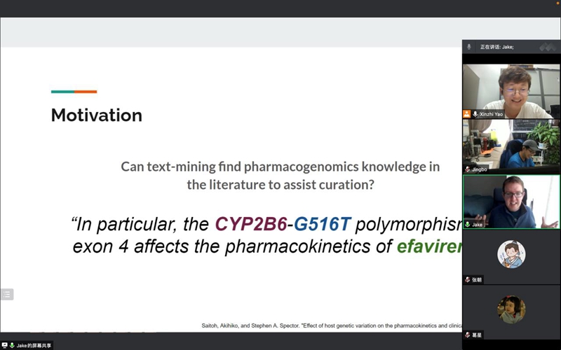 本次报告分为“Finding knowledge for biocurators”“Relation extraction at PubMed scale”“Categorizing coronavirus research”3部分,Jake Lever博士使用图表与动画结合,深入浅出地介绍了文本挖掘辅助精准医学的生物治疗过程,会后,参会师生就分享内容提出一系列问题,如“怎么样更可靠地挑选在多种癌症中起到关键作用的基因?”“文本通常是描述群体的,文本挖掘方法真的可以辅助精准医疗吗?”“机器学习更容易平衡P值和召回,深度学习如何才能做到这一点?”等问题,Jake博士针对大家的问题展开一系列解答,大家进行友好交流,与会者表示收获颇丰。