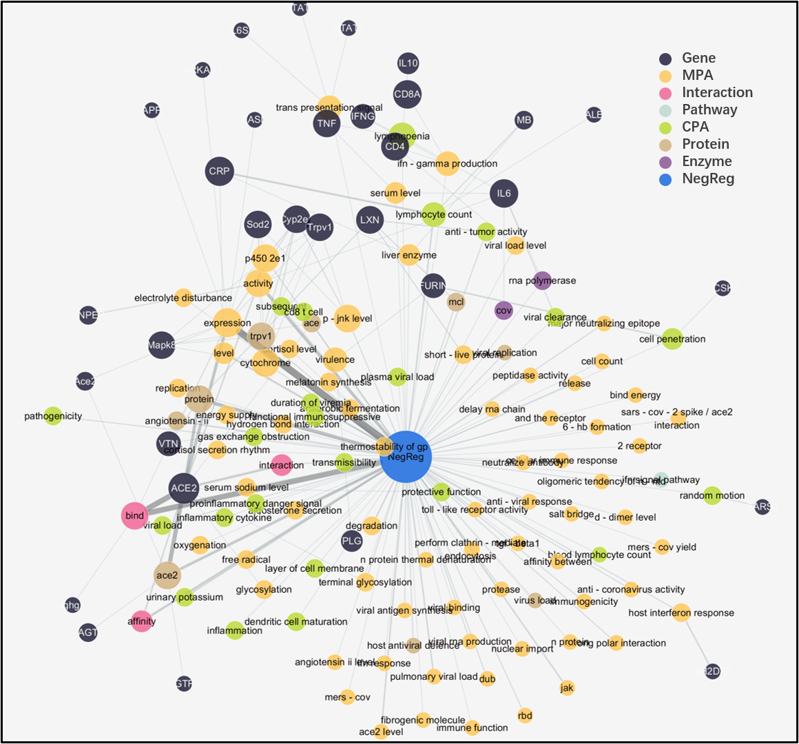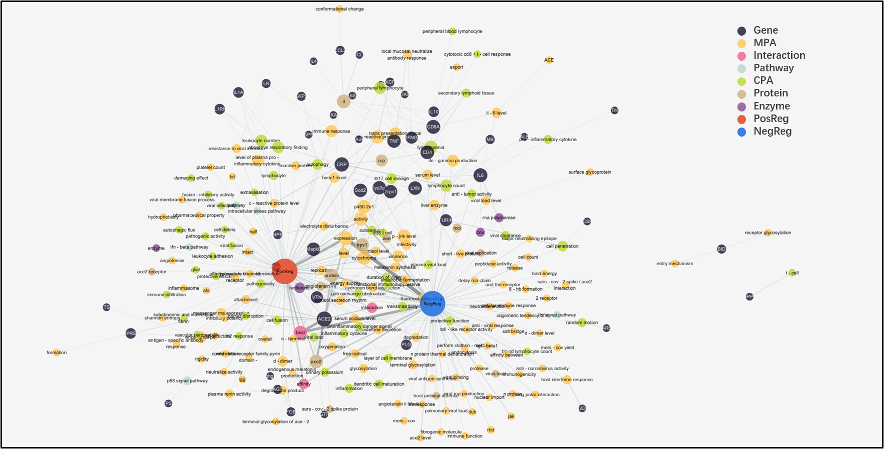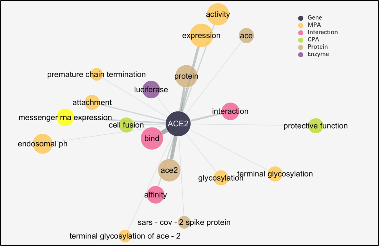 To investigate the changed biological processes and the related gene in Covid-19 literatures, we extracted the words that annotated by AGAC and the gene annotated by Litcovid which co- occurred in sentence-level. Figure at the left shows the biological processes in ACE2 gene, there is a strong relation between ACE2 and “bind” which is annotated as Interaction by AGAC. It means ACE2 related binding are concerned a lot in the Covid-19 research.