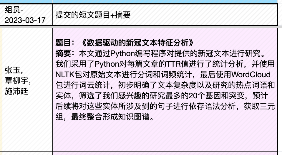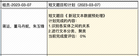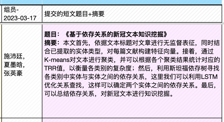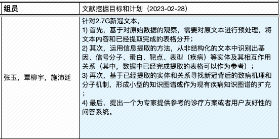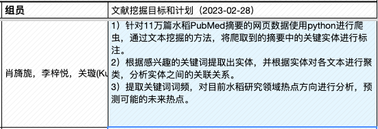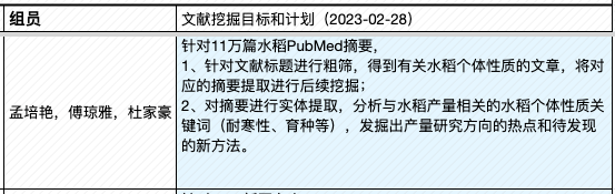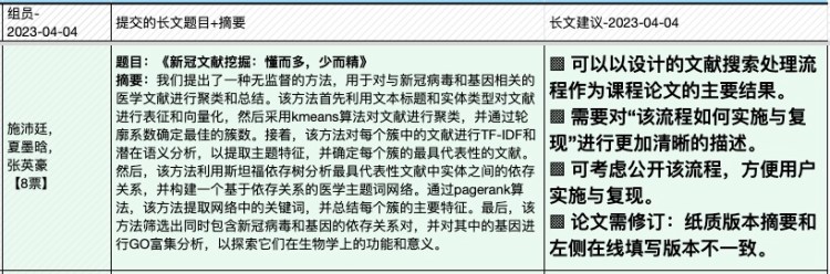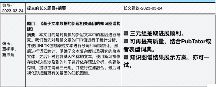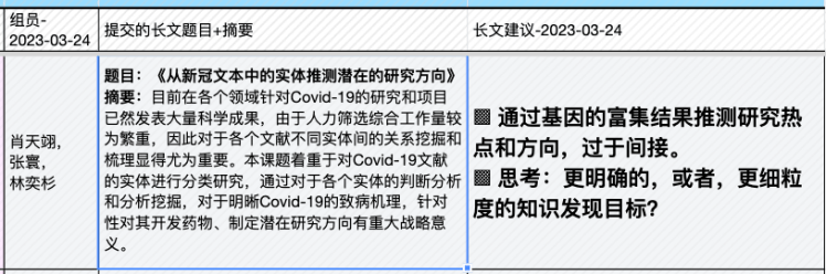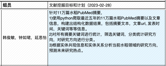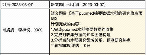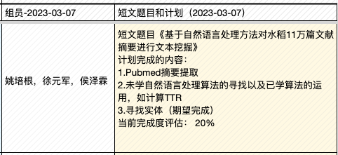 | 4, Apr | (课程大论文长文修订稿提交日) ▩ Quiz C:《作物、疾病文献挖掘》小组汇报 【水稻文献挖掘部分】 —肖旖旎,李梓悦,董马丹妮:《基于PubMed摘要数据的水稻敏感性 研究分析》 —姚培根,徐元军,侯泽霖:《水稻文献基于SciSpacy进行NER并构建语义图数据库》 —孟培艳,傅琼雅,杜家豪:《探索水稻抗病基因对水稻的影响》 【新冠文献挖掘部分】 —肖天翊,张寰,林奕杉:《从新冠文本中的实体推测潜在的研究方向》 —张玉,覃柳宇,施沛廷:《基于文本数据的新冠相关基因的知识图谱构建》 —赵明洁,黄丽云,张英豪:《解密新冠疫情话题:实体、网络与聚类的探索之旅》 —蒋运,董马丹妮,朱玉锋:《新冠文本数据预处理》 专题3:《生物文本挖掘和知识图谱》 |