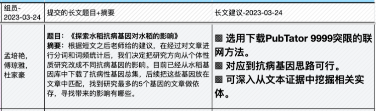 | 24, Mar 实验课 | (课程大论文长文初稿提交日) ◎ Quiz B:代码考核 +《作物、疾病文献挖掘》小组汇报 —施沛廷,夏墨晗,张英豪《基于依存关系的新冠文本知识挖掘》(串场:张家赫) —韩俊敏,延思怡,钟如珺《基于PubMed水稻文献信息挖掘基因-抗性关系》(串场:邱一埕) ◎ 实验任务四、《PubMed文献实体识别》 |