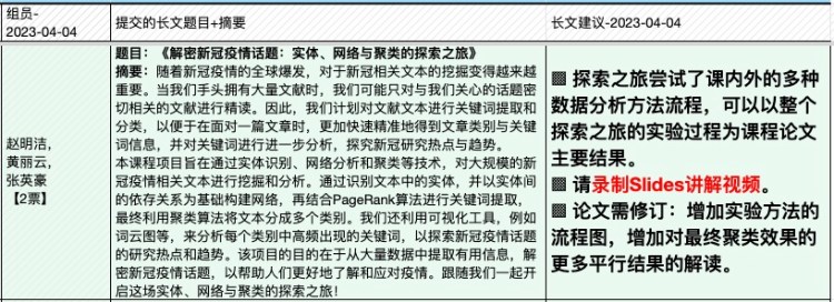 | 14, Apr | (课程大论文长文最终稿(pdf)提交日) —截止时间:2023年4月14日23点59分。 —请依据修订意见,提交课程论文pdf电子版到课程微信群。(论文集) |