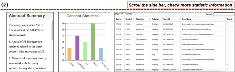 - Click the edge between the mutation and the phenotype of one’s interest, and a pop-up window will show the corresponding literature evidence. The evidence showcasing is given in a rich annotation form where the mutation, gene and phenotype are all marked in color.