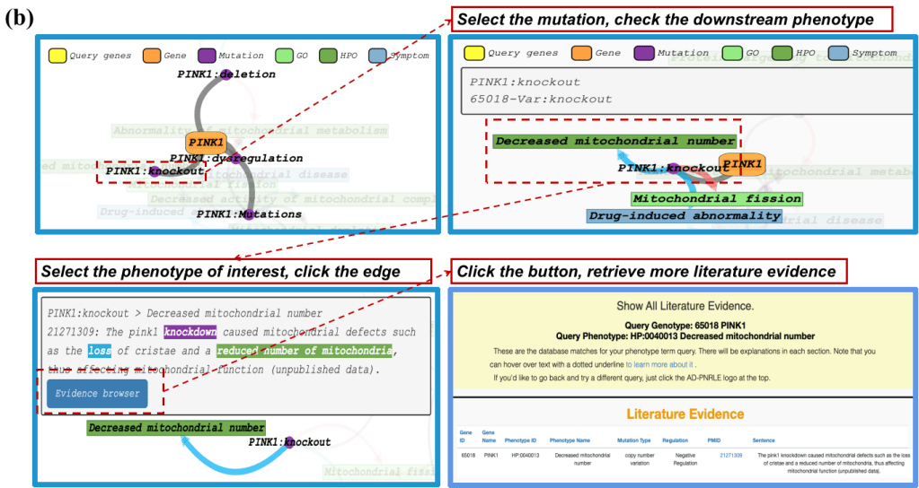 - 点击突变和待探索表型的连边,悬浮窗展示相关机理的文本证据,并以富标注风格对突变、基因等生物标志物和表型描述项予以高亮。
