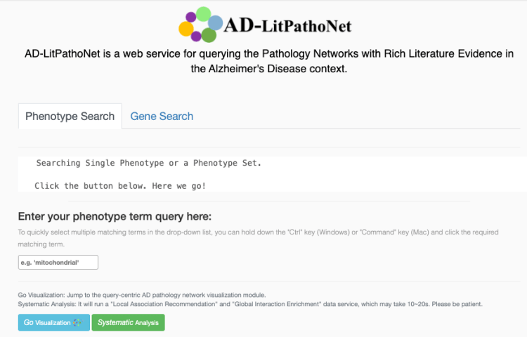 AD-LitPathoNet是“阿兹海默症-富文本证据病理网络”(Pathology Network with Rich Literature Evidence)的简称。AD-LitPathoNet提供便捷可交互的基因和表型搜索服务,从而提供关联推荐、互作富集,以及文本证据的可视化呈现。AD-LitPathoNet提供的启发性的文献证据自动化搜索服务无商业用途,旨在为AD-机理探索的科学研究提供服务。