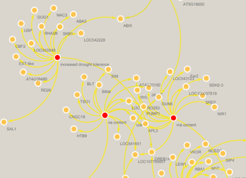 There are 323 red nodes which represent plant trait (not only just rice, all plants included) and the 119 yellow nodes are the genes. Lines between the red and yellow nodes represent the co-occurrence of corresponding plant trait and gene in one sentence at least four times. Also, we have lines link yellow and yellow nodes which implied they may have interaction effect.