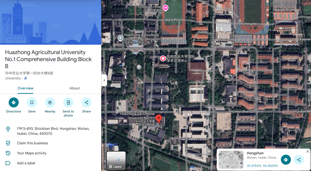 Location: Huazhong Agricultural University No.1 Comprehensive Building Block B (第一综合楼B座). It is within a 4-mins walking distance between the hotel and the office building. Office rooms and the meeting room are all located in this building.